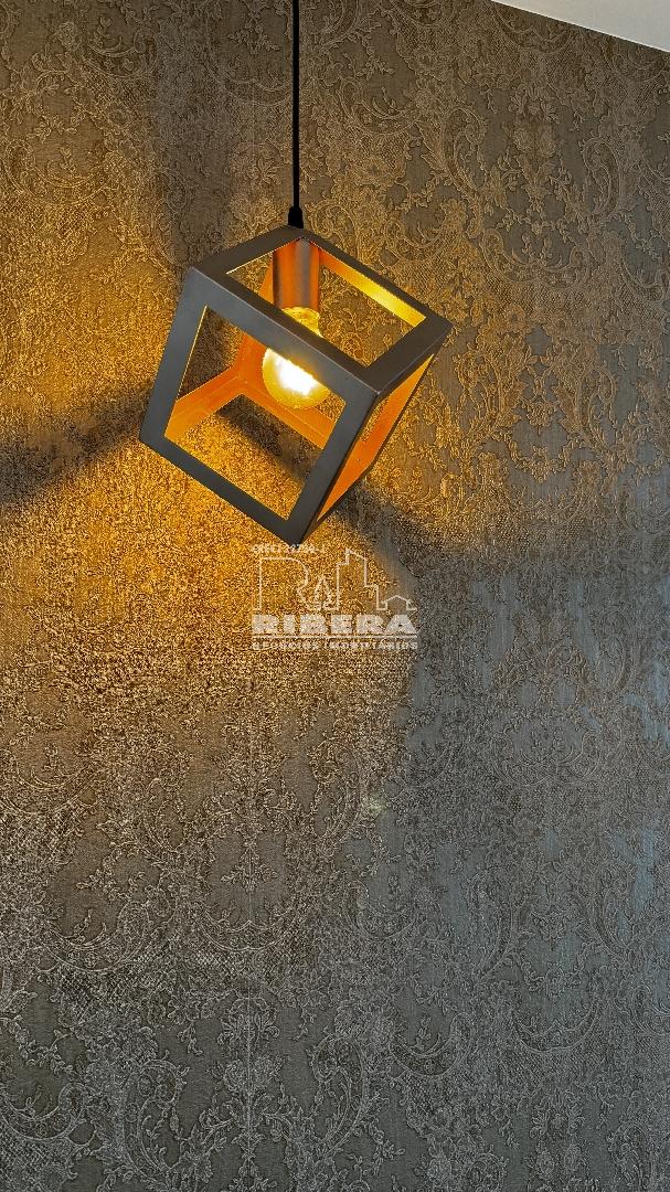 Sala de Jantar: Com lustre e papel de parede.