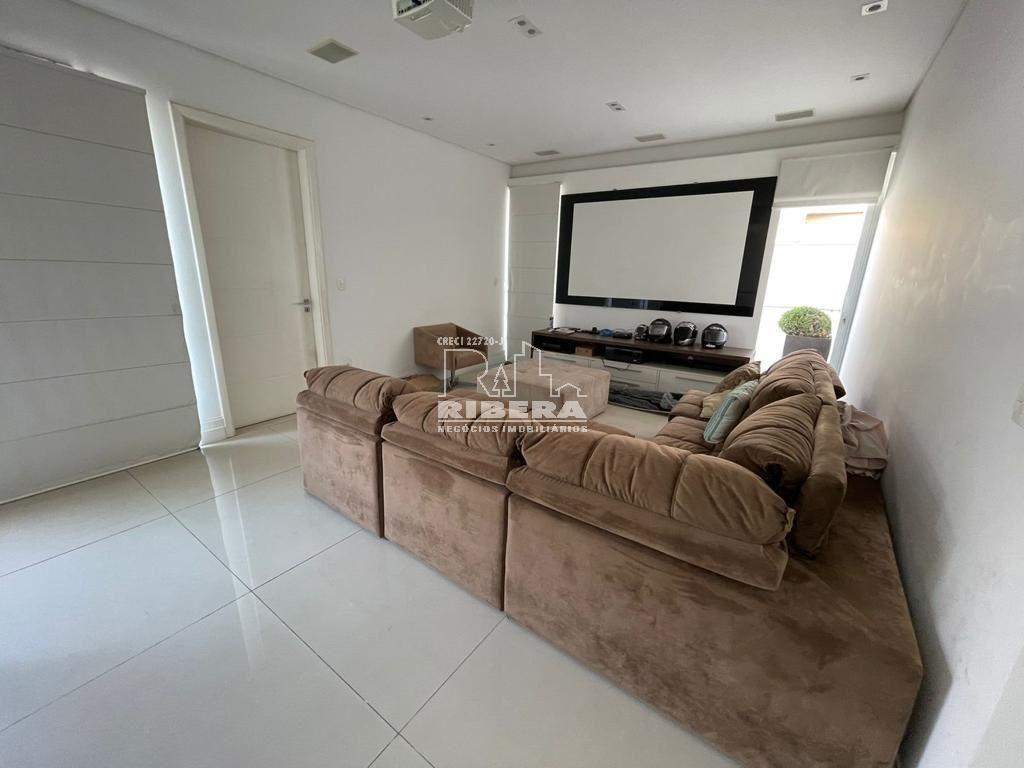 Sala de home theater com telão de 90 polegadas, com possibilidade de transformação em escritório.